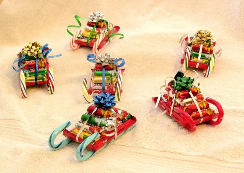 - Сладкие санки – при помощи клеевого пистолета объедините конфеты. Внизу добавьте леденцы в виде тросточек, свяжите лентой.
