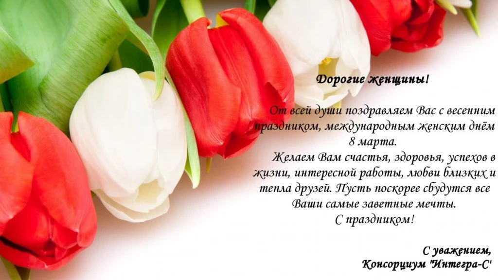 Сегодня, в Международный женский день, мы желаем вам всего самого светлого и прекрасного! Пусть весна расцветает в душе и наполняет ее радостью и красотой! Пусть этот праздник оставит множество ярких впечатлений и красивых, романтических моментов! Пусть невозможное — станет возможным! Успехов и радости во всем!