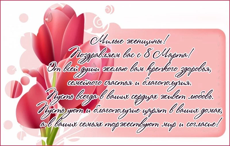 Поздравляю с восьмым марта! Пусть в этот замечательный праздник тебя согреет ласковыми и теплыми лучами нежное весеннее солнце. Добрые улыбки и полные любви глаза всех твоих близких и родных греют сердце. Пусть тебя сопровождают счастье, успех и любовь, которые сделают твою жизнь светлой и прекрасной.