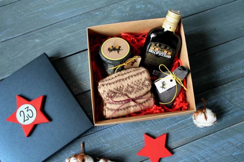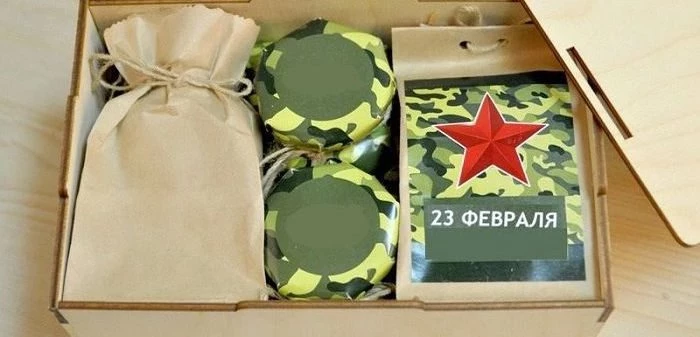 Можно подарить мужчинам-коллегам на 23 февраля недорогие, но приятные наборы, которые легко собираются самостоятельно. Подобрать состав лучше для каждого защитника отдельно, учитывая пристрастия. Особенно актуально такое решение в маленьких коллективах: