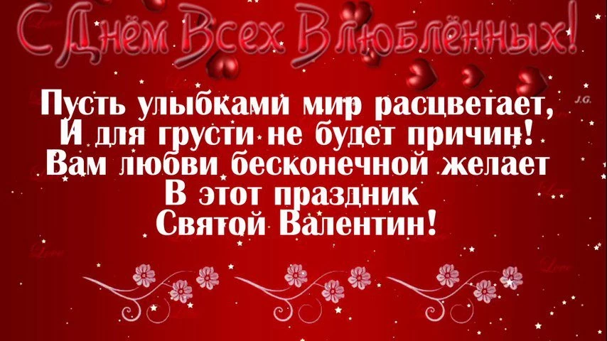 Какое счастье, когда есть любимый и любящий человек! С ним не страшны никакие трудности, ведь вместе вы – сила. Он всегда поднимет настроение, поддержит. А как прекрасны моменты с ним, даже если это просто утренний кофе или общая любимая песня! И в День святого Валентина желаю тебе встретить именно такого человека – любящего и любимого!