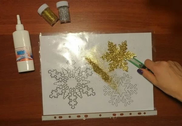 Готовые шаблоны можно найти в Интернете. Шаблон помещаем в заранее подготовленный файл, он обязательно должен быть прозрачным. Теперь обводим силуэт снежинки с помощью клея ПВА. Пока поверхность не высохла ее можно посыпать глиттером, чтобы придать более красочный вид. Ждем пока изделие высохнет. Ускорить процесс можно разместив снежинки около отопительного радиатора. Важно дождаться полного высыхания заготовки, чтобы она была максимально прочной.Советуем прочитать
