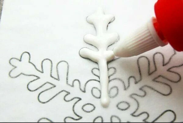 Сейчас большой популярностью стали пользоваться снежинки из клея, благодаря своей прозрачной консистенции или белому цвету ПВА, узоры приобретают более реалистичный внешний вид.