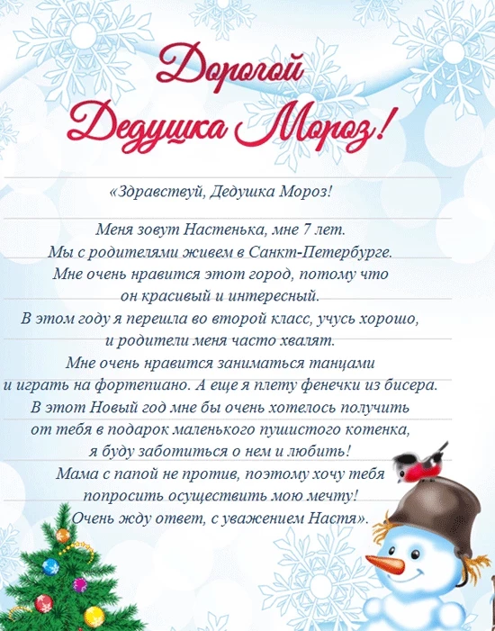 Прочитав пример письма Деду Морозу, можно написать свое собственное.