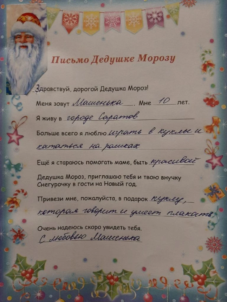 «Самый лучший Дедушка Мороз, меня зовут Мария. Мне 7 годиков. Можешь привезти мне шахматы, телефон сенсорный с чехлом для него и босоножки. А еще маме самый красивый браслет из золота с бриллиантами. И папе, а у папы есть мама. Он и так самый счастливый. Я обещаю также продолжать слушаться родителей, учиться на одни пятерки. Подарив нам все это, ты сделаешь мир немного счастливей. Желаю тебе всего самого наилучшего, особенно неугасаемой любви, щедрости, доброты и сил. С любовью, Мария!»