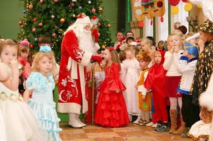 Вступление начинается с выхода Деда Мороза на сцену под праздничную музыку и произнесения речи ученикам и преподавателям.