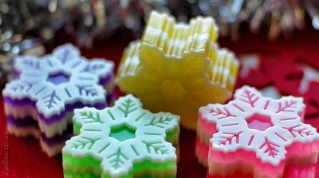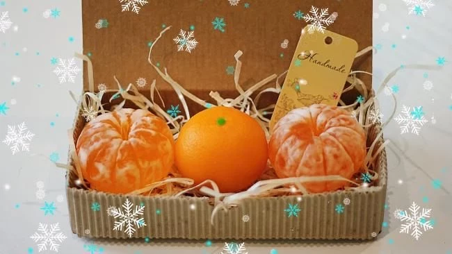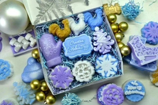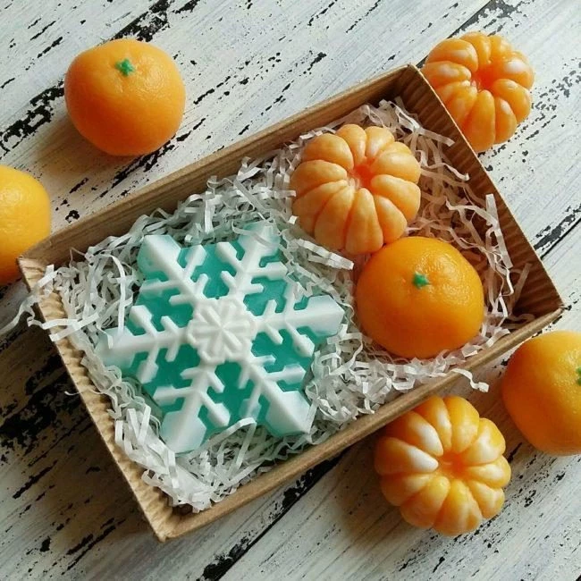 - Сувениры мыльные – можно сделать мыло своими руками, купив специальный набор. Берите тематический, чтобы или мыльные мандаринки, или сладости новогодние из мыла.