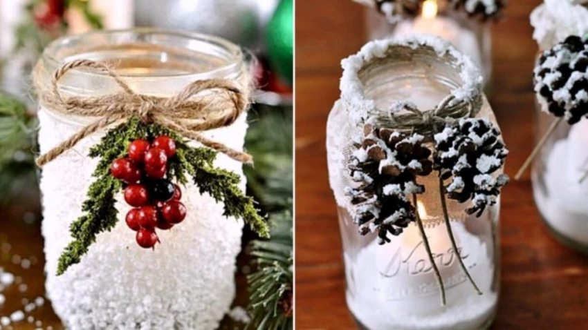- После этого горло банки нужно декорировать шишками, еловыми или сосновыми ветками и рябиной. Украшения прикрепить при помощи бечевки.