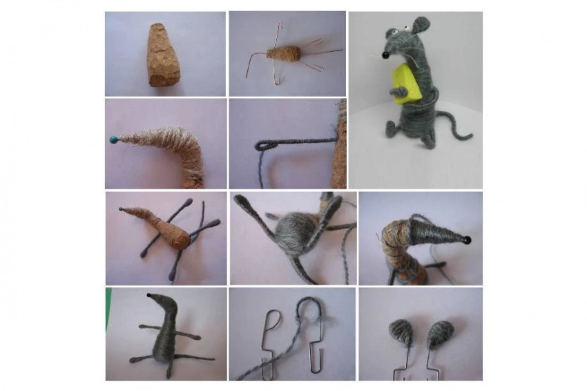 В первую очередь нужно при помощи острого ножа выстругать конусообразную деталь из винной пробки – это будет заготовка для туловища грызуна. Из канцелярских скрепок нужно сделать металлический каркас, согнув их соответствующим образом, как представлено на фото. Основу туловища необходимо обмазать клеем ПВА и обернуть толстой серой пряжей. Затем следует сделать мордочку, приклеив носик и глаза-бусинки. Из полимерной глины нужно слепить треугольную деталь – это будет кусочек сыра. Проделать в нем дырочки при помощи острого карандаша. После того как грызун займет подходящую позу (сформировать по желанию), ему в лапки нужно вложить кусочек сыра.Мышка в шапочке 2020 своими руками