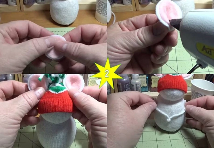 Готовые ушки приклеиваем прямо к шапочке так, чтобы казалось, что они выглядывают из нее.