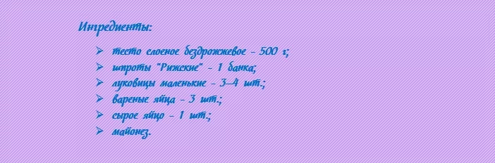 Подготовим начинку. Луковицы нарежем тонкими кругами. Разбирать на колечки не надо. Зальем маринадом: 3 ст. л. 9 % уксуса, 5 ст. л. воды, 3 ст. л. сахара. Оставим на полчаса. От шпротов отрежем хвостики. Яйца порежем кружками. Листы слоеного теста разморозим (не полностью, до эластичности). Разрежем на квадраты 8 х 8 см. Разложим на покрытом пергаментом для выпечке противне. На каждый квадрат выложим: кружок яйца, кружок лука, по диагонали — шпроты. Два уголка теста (по бокам шпротин) свернем к середине, скрепим. Другие стороны закусочных пирожков оставим открытыми. Чтобы закуска получилась красивой и румяной, смажем верх слоеного теста смесью яичного желтка с 1 ст. л. жирного молока или майонезом. Выпечем при 200 °. Время — 15—20 мин.Советуем прочитать