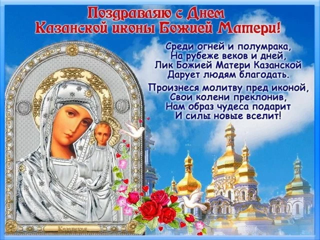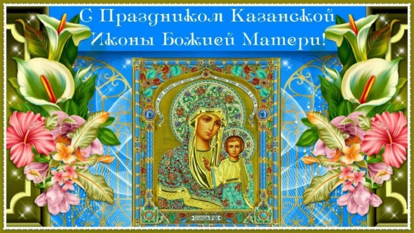 Перед иконой Казанской Божьей Матери мы просим исцеленья, обращаемся к ней, когда нам тяжело. Поздравляю со светлым и великим праздником и желаю, чтобы в сердце вера в Бога не иссякала, а Ангел-хранитель не покидал ни на мгновенье.