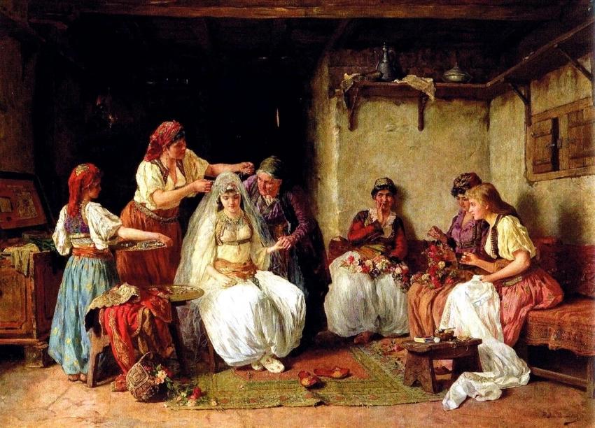 С момента помолвки невесту никто не смел трогать, девушка шила свое приданое, занималась домашними хлопотами, при этом она должна была повязать на голове платок, поскольку ей нужно было «умереть» и заново родиться, уже под крылом мужа.