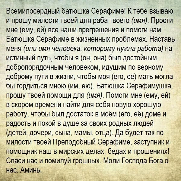 Текст молитвы о быстром трудоустройстве: “Батюшка всемилосердный Серафиме! Я к тебе взываю и молю о помощи для раба Божьего (имя). Прости мне все прегрешения и помоги, Серафиме батюшка, в решении жизненных проблем и трудностей.