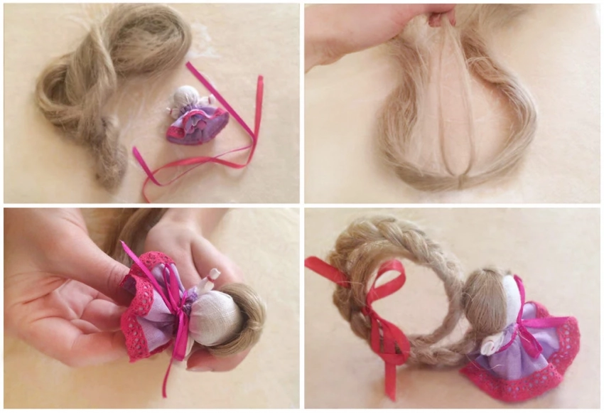 Для косы нужно распределить пучок льна на голове фигурки так, чтобы не было просветов, и подвязать у шеи нитью. Далее — сплести очень тугую косичку, снова зафиксировать нитью, и украсить бантиком из второй ленточки.