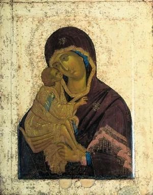 Богоматерь как бы предвидит трагическую судьбу своего сына. Но лицо ее не только печально; оно отражает внутреннюю просветленность, что придает ему оттенок особой мягкости, несвойственный византийским иконам на эту же тему. Такого выражения мягкой человечности художник достигает с помощью певучего цвета с интенсивными ударами драгоценной ляпис-лазури и с помощью умелого использования плавных, округлых линий, в которых нет ничего жесткого и стремительного. |