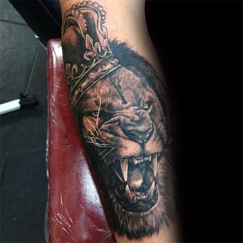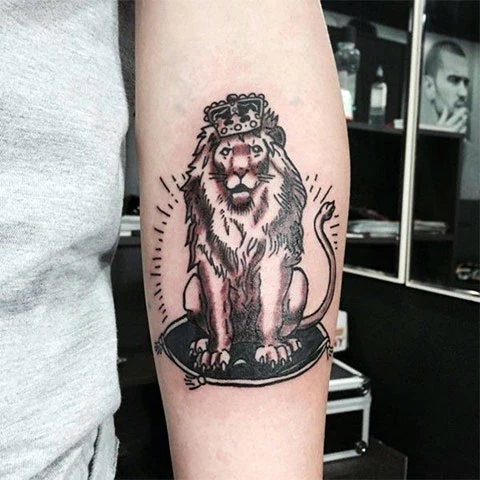 Тату лев с короной на руке у мужчины