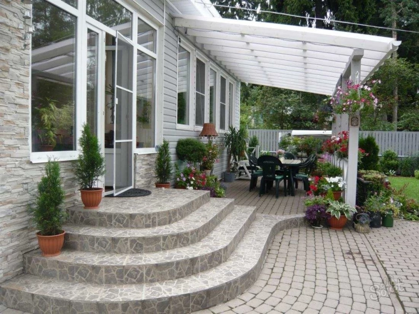- Отделанное плиткой и поликарбонатом.Плитка укладывается на бетонный или кирпичный фундамент. Существует огромное разнообразие видов плитки с различными эффектами. Поликарбонатом отделывается навес и стены пристройки. Он является недорогим, легким и гибким материалом, очень подходящим для создания крылечного козырька.