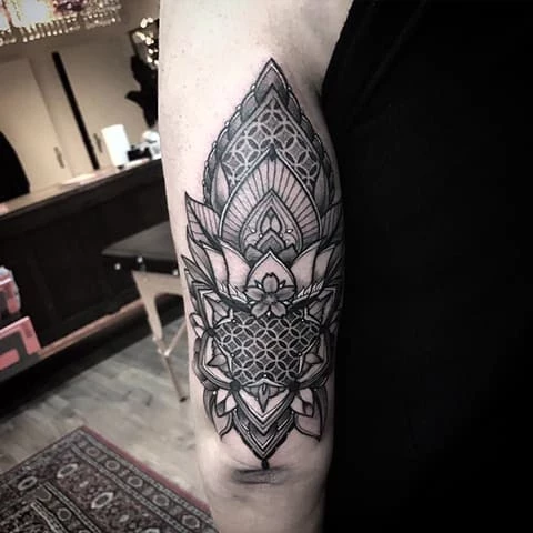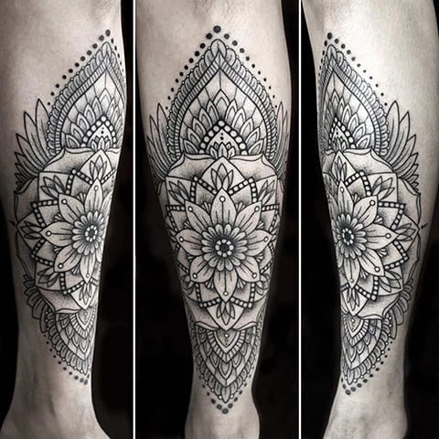Это самый распространенный дизайн татуажа мандалы. Цветы прекрасны сами по себе, но когда вы используете их в изображении мандалы, результатом будет шедевр. Такая татуировка набивается чистыми черными чернилами. Однако есть люди, предпочитающие цветные татуировки мандалы. Тату строится из геометрических фигур, как простая мандала, но внутри оформляется цветами.