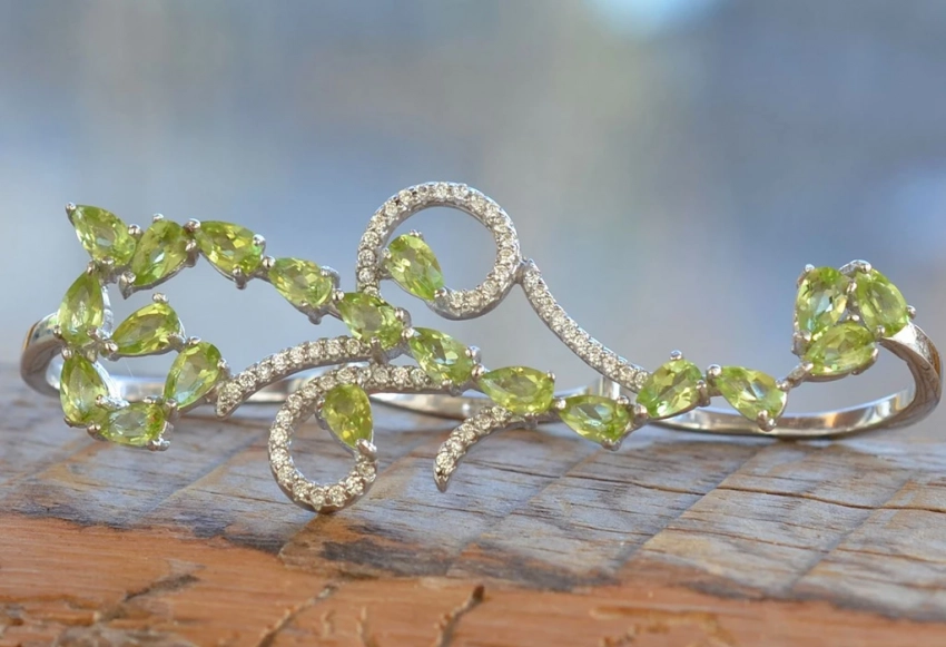 Цветной оливин (перидот) активно применяется в ювелирном деле. С ним делают золотые и серебряные украшения: серьги, подвески, браслеты, кулоны, броши и кольца.