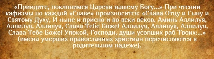 Читая хвалебные песнопения в домашних условиях, нужно помнить, что после каждого произнесения славы Святой Троице нужно читать заупокойную молитву. Эти же слова произносятся по окончании каждой главы Псалтыря. Когда чтение святых псалмов подойдет к концу, нужно прочесть заупокойный Канон. Такой порядок в 1973 году установила Московская Патриархия.