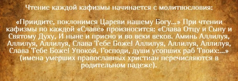 Если в издании по какой-либо причине нет вступительного текста, то можно перед чтением кафизм произнести на память «Молитвами святых отец наших». На следующем этапе читают «Славу», а после – «Царю Небесный». Затем действуют по описанной схеме.