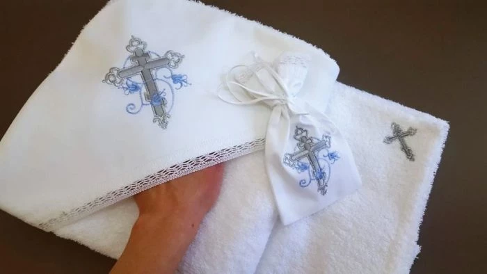 - Крестильный наряд. Сейчас дарят специальные наборы для девочек, в которые входит крыжма (полотенце или пеленка с христианской символикой, куда ребенка заворачивают после опускания в купель), сорочка, чепчик, пинетки. Дополнительно можно вышить на каждом предмете крестик. Перед началом Таинства вещи освящаются, а после процедуры родная мама бережно хранит их всю жизнь.