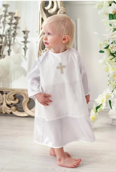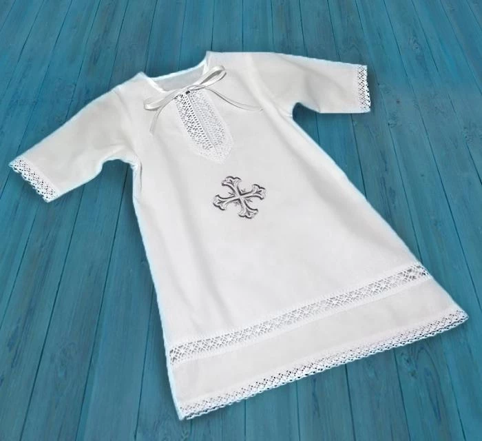 Крёстная должна подарить крестильный наряд: белую крестильную длинную рубашку и белый чепчик. Чаще всего наряд делается из хлопковой ткани и украшается вышивкой, лентами и бусинами, но обязателен из всего этого великолепия только крест (он может быть на груди или на спинке).