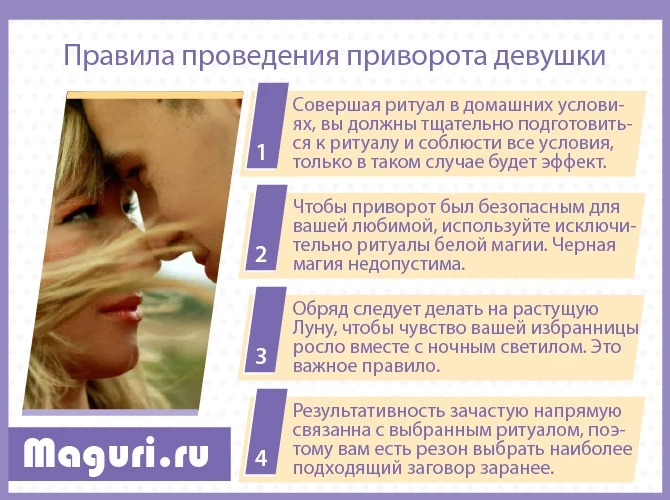 У избранницы не должно никого быть на личном фронте. Если Вы решили вернуть бывшую любовь, с момента расставания должно пройти не больше года, иначе положительного результата не будет. Даму сердца исполнитель должен хорошо знать и общаться с ней. К ненаглядной нужно относиться со всей душой. Не стоит использовать чары ради развлечения.
