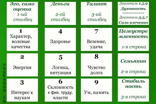 - Эти цифры расписывают по девяти квадратам матрицы от 1 до 9. Затем анализируют таблицу, делают выводы о том, какие черты характера и таланты заложены в человеке судьбой.
