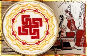 Сам символ вышивается обычно нитками красного цвета. Но можно использовать желтый или зеленый цвет.