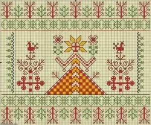 Очень часто славянский оберег Макошь встречается в виде вышивки. Схема этой вышивки проста, поэтому вышить оберег сможет даже неопытная мастерица. Приступать к вышиванию оберега лучше всего на растущую луну. Можно сесть за вышивание и в полнолуние. Главное во время изготовления вышивки сохранять хорошее настроение, не унывать и не быть уставшими.