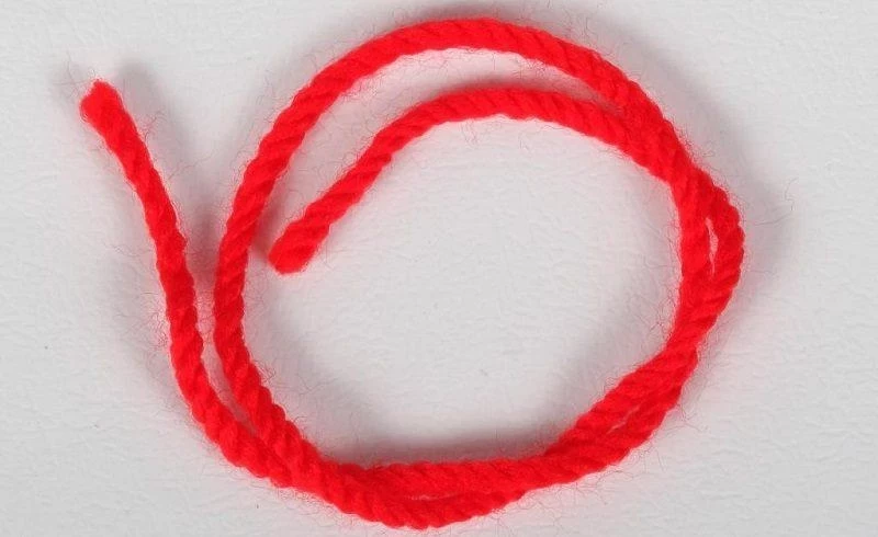 Понадобится взять красную нить из шерсти и сформировать на ней 9 узлов. Следует обратить внимание, что узлы должны быть одинаково удалены друг от друга, т. е. между каждым из них должно быть равное расстояние.