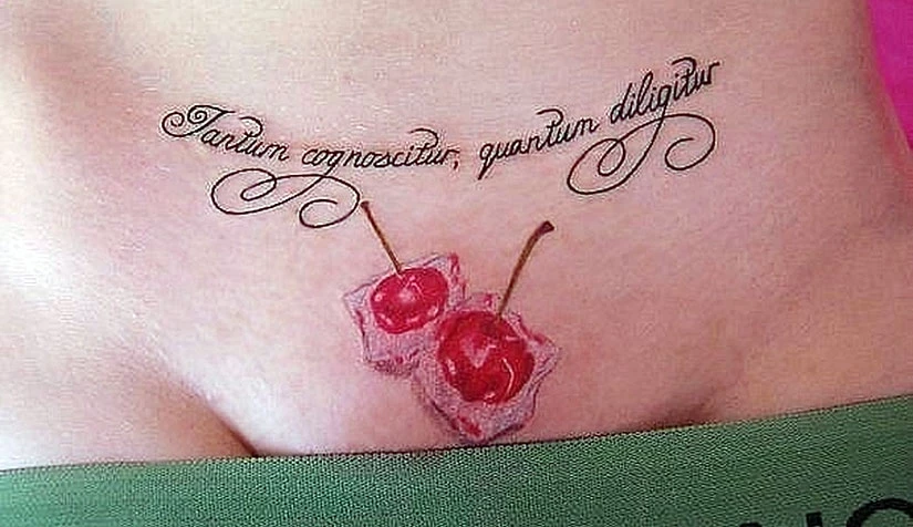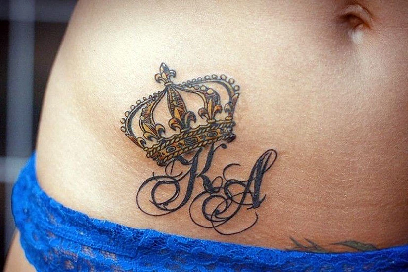 Тату на шрамах и на растяжках. Зачастую изображения располагаются в местах шрамов, которые появились после родов у беременных, либо после операции. Это отличный вариант скрыть рубцы или перекрыть растяжки, которые возникли в процессе вынашивания плода. Девушки любят располагать на местах шрамов абсолютно различные изображения, в числе которых след от когтей, бабочек, корону, алмаз, кошачьи лапки и др. Однако важно помнить, что на случай сокрытия рубцов, эскизы необходимо подбирать по силуэту, размеру и по цвету. Шрам от аппендицита короткий, но грубый, поэтому для того, чтобы скрыть его как можно лучше, необходимо выбрать цветную, детализированную тату. Шрам от кесарева сечения – более длинный, но тонкий. Лучше выбирать более крупные эскизы тёмных, насыщенных цветов и т.д.