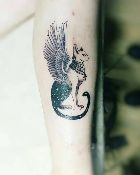 Коты и крылья по отдельности символизируют свободу, а их совместное изображение скрывает в себе тайный посыл своего носителя вырваться с помощью невидимых крыльев из привычных рамок, символизирует тягу к независимости. Тату сфинкс с крыльями воплощает в себе и свет, и темноту, и явно намекает на противоречивую натуру своего обладателя, который может быть одновременно и тёмным демоном, и милым ангелом.