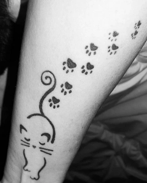 Кошачьи следы на теле также символизируют своенравный характер и особенность их обладателя легко выкарабкиваться из сложных жизненных ситуаций. Человек, который набивает подобную татуировку на своём теле, всегда, словно кошка может мягко приземлиться, если это потребуется. Такое тату считается своеобразной защитой, ведь кошки как считалось издавна имеют 9 жизней.