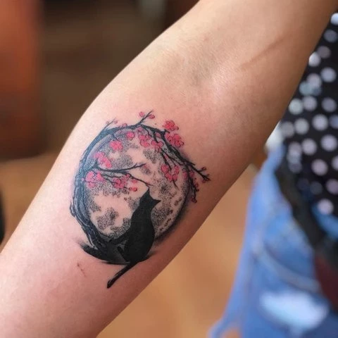Кошка на фоне луны указывает на таинственность личности, утончённость. В таком рисунке скрыта независимость характера обладателя тату и его большое желание выделиться. Татуировка кошки на луне или на фоне месяца символизирует также надежду на семейное счастье и уют в доме.
