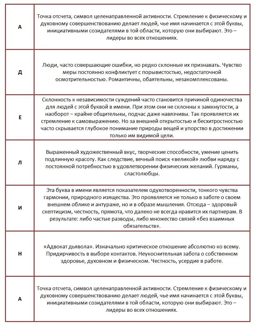 Число имени – шестерка | Люди-“шестерки” ответственны и дисциплинированны, что помогает им преуспеть в профессии. Они обладают обостренным чувством справедливости, поэтому безвозмездно готовы прийти на помощь человеку, попавшему в беду |